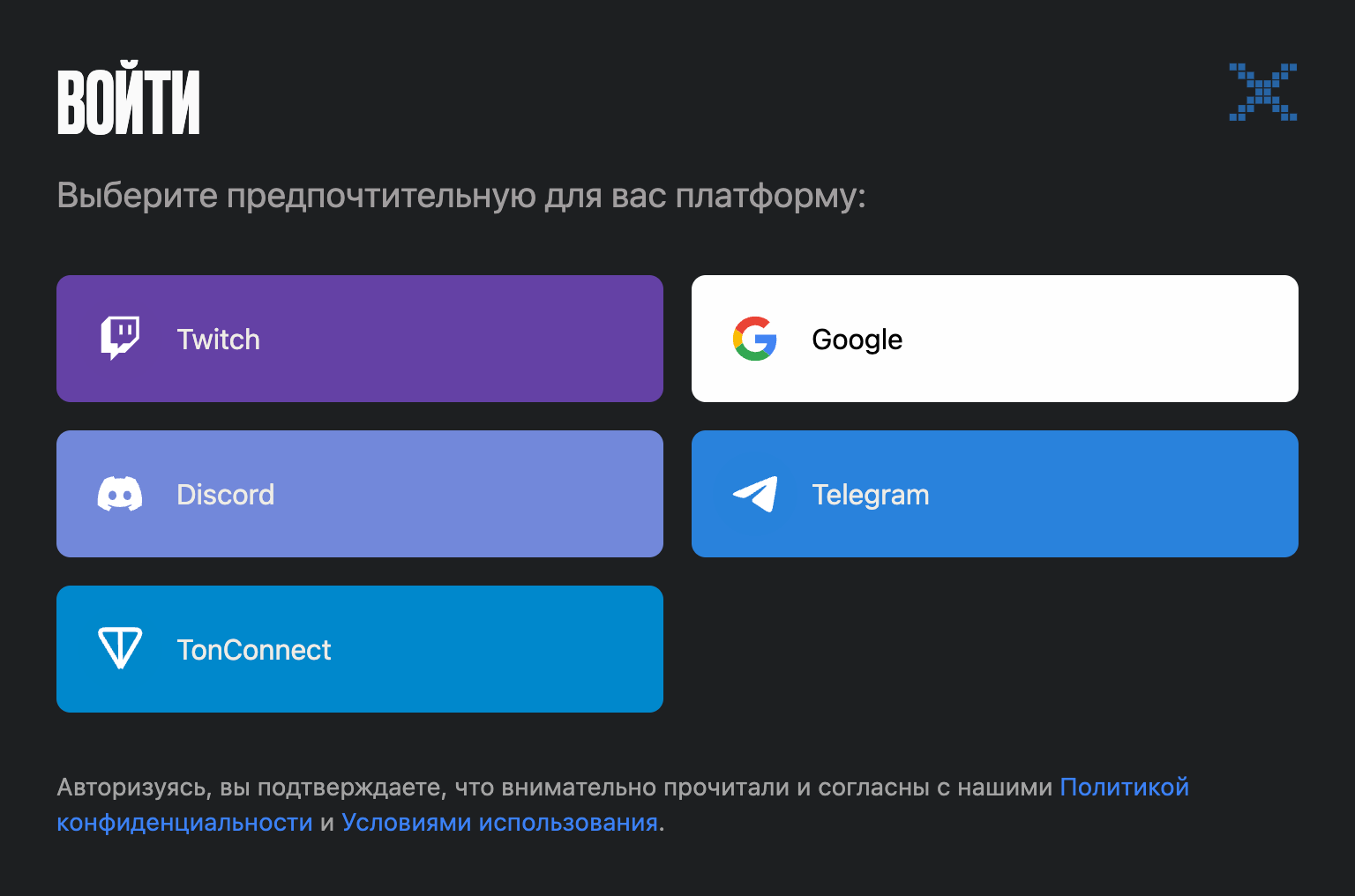 * Войдите через Google, Twitch, Discord или другие поддерживаемые платформы, выбрав нужную опцию.