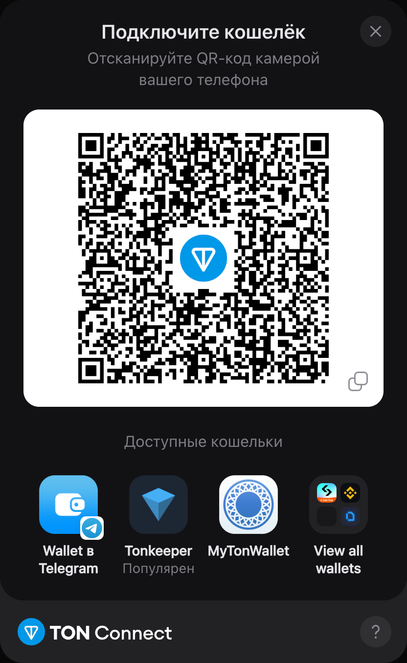 * Используйте свой криптовалютный кошелек, поддерживающий TON Connect (например, Tonkeeper, Wallet, и т.д.).